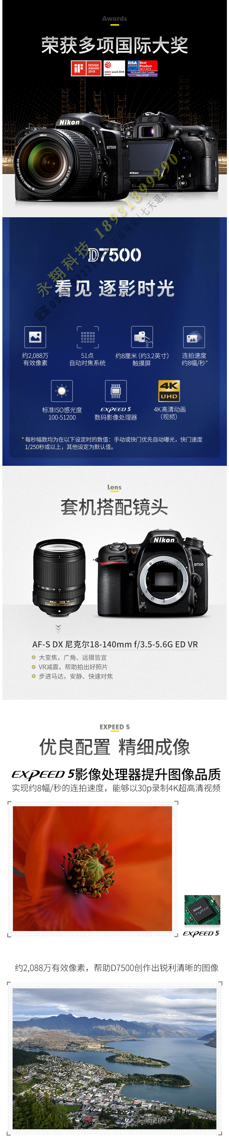 • 商品名称:尼康(Nikon)D7500 单反相机 数码相机 (AF-S DX 尼克尔 18-140mm f/3.5-5.6G ED VR 单反镜头)