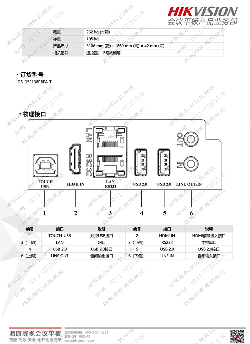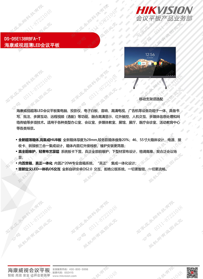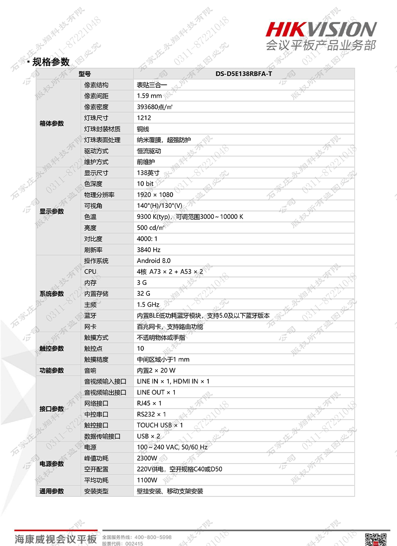 屏体参数 屏幕尺寸 138吋 面板类型 COB封装LED高清显示面板 屏幕分辨率 1920*1080 像素间距(mm) 1.5 屏幕亮度(cd/m2) 450 对比度 6000:1 可视角度(水平/垂直) 170°/160° 灰度(bit) 16 刷新率(Hz) 3840 屏体单元防护等级 IP65(正面) 维护方式 前维护 系统平台 内置系统 安卓/Windows双系统 * 安卓硬件配置 华为海思V811+4G DDR+32G EMMC 安卓系统版本 Android 8.0 Windows系统配置 I5 CPU+8G内存+256G 固态硬盘 * Windows系统版本 Windows 10 触摸特性 触摸技术 红外触摸,10点 触摸分辨率(免驱) 32767*32767 触摸识别尺寸(mm) 6 触摸精度(mm) 1 触控交互方式 手指或者软头触摸笔 响应时间(ms) 9.5 无线传屏 支持传屏终端 安卓手机、iPhone、iPad、Windows电脑、MAC电脑** 硬件传屏器 支持 支持多分屏同传 9分屏 反向控制 支持反向控制** 视频会议 视频分辨率 720P 异地投屏 支持 云端会议录制 支持*** 硬件会议终端兼容接入 支持华为、思科、宝利通等品牌主流硬件会议终端接入**** 会议云直播 支持***** 摄像头 4K超高清分辨率传感器、电子云台控制、数字变焦、智能场景检测 全向麦 5米拾音距离、无线传输 特色功能 书写白板 智能多点书写白板 语音控制 内置小曼语音助手 一键熄屏 可一键(或者语音控制)进入熄屏状态,一键唤醒 内置音响 内置2*15W 功能接口 视频输入 HDMI*1(侧面),HDMI*1(前置) 音视频输出 HDMI OUT*1,3.5mm Earphone*1(侧面) 触摸输出 USB-B*1(侧面) 数据输入输出 USB3.0*1,USB2.0*3(前置面板) 网络接口 LAN*1、双频WIFI*2(支持无线热点) 电气参数 峰值功耗(W) 1800 平均功耗(W) 600 待机功耗(W) 0.5 供电要求 100-240V/AC(50-60Hz)