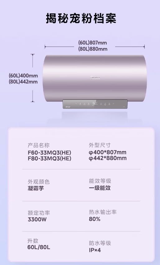 • 商品名称:美的(Midea)美家系列活水电热水器储水式3300W大功率速热 终身免换镁棒安全一级能效节能智能家电 【60升】F60-33MQ3