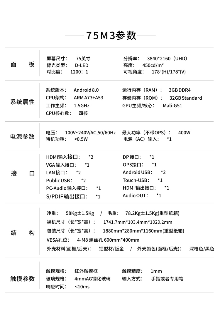 • 商品名称:皓丽HorionM3系列 智能会议平板75英寸4K高清 电子白板办公教学交互式 一体机75M3