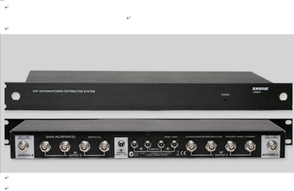 舒尔UA844+天线分配系统可将一对天线分频至多台接收机,达到扩展无线话筒系统的目的。UA844+还可放大射频信号,补偿因信号功率被分至多个输出而造成的插入损耗。单个UA844+系统可支持五个无线接收机。双层配置中可使用五个UA844+系统。