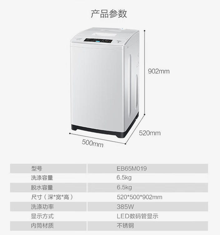 • 商品名称:海尔(Haier)洗衣机 全自动波轮 家用宿舍脱水机洗衣机 6.5KG 小神童B6M019